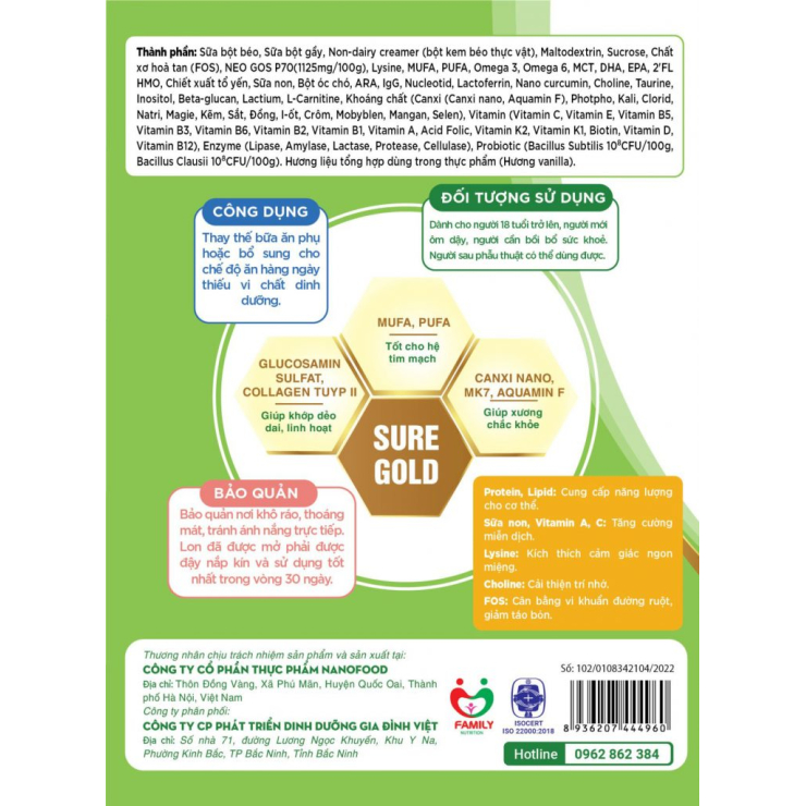 – Sữa bột béo, Sữa bột gầy, Non-dairy creamer (bột kem béo thực vật), Maltodextrin, Sucrose, Chất xơ hoà tan (FOS), NEO GOS P70(1125mg/100g), Lysine, MUFA, PUFA, Omega 3, Omega 6, MCT, DHA, EPA, 2’FL HMO, Chiết xuất tổ yến, Sữa non, Bột óc chó, ARA, IgG, Nucleotid, Lactoferrin, Nano curcumin, Choline, Taurine, Inositol, Beta-glucan, Lactium, L-Carnitine, Khoảng chất (Canxi (Canxi nano, Aquamin F), Photpho, Kali, Clorid, Natri, Magie, Kẽm, Sắt, Đồng, I-ốt, Crôm, Mobyblen, Mangan, Selen), Vitamin (Vitamin C, Vitamin E, Vitamin B5, Vitamin B3, Vitamin B6, Vitamin B2, Vitamin B1, Vitamin A, Acid Folic, Vitamin K2, Vitamin K1, Biotin, Vitamin D, Vitamin B12), Enzyme (Lipase, Amylase, Lactase, Protease, Cellulase), Probiotic (Bacillus Subtilis 10°CFU/100g, Bacillus Clausii 10 CFU/100g). Hương liệu tổng hợp dùng trong thực phẩm (Hương vanilla).